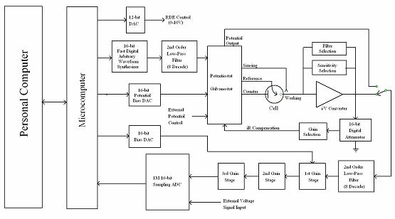 600E為通用電化學(xué)測(cè)量系統(tǒng)。下圖為儀器的硬件結(jié)構(gòu)示意圖。儀器內(nèi)含快速數(shù)字信號(hào)發(fā)生器,用于高頻交流阻抗測(cè)量的直接數(shù)字信號(hào)合成器,雙通道高速數(shù)據(jù)采集系統(tǒng),電位電流信號(hào)濾波器,多級(jí)信號(hào)增益,iR降補(bǔ)償電路,以及恒電位儀/恒電流儀(660E)。電位范圍為10V,電流范圍為250mA。電流測(cè)量下限低于10pA。可直接用于超微電上的穩(wěn)態(tài)電流測(cè)量。如果與 200B微電流放大器及屏蔽箱連接,可測(cè)量1pA或更低的電流。如果與