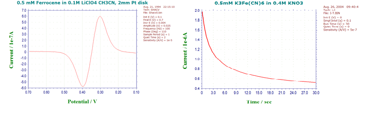 恒電位儀 零阻電流計(jì) 2,3,4電結(jié)構(gòu) 浮動(dòng)地線或?qū)嵉?span lang="EN-US"> 大電位范圍:±10V 大電流:±250mA連續(xù),±350mA峰值 槽壓:±13V 恒電位儀上升時(shí)間:小于1s,通常0.8s 恒電位儀帶寬(-3分貝):1MHz 所加電位范圍:±10mV, ±50mV, ±100mV, ±650mV, ±3.276V, ±6.553V, ±10V 所加電位分辨:電位范圍的0.0015% 所加電位準(zhǔn)確度:±1mV,±滿量程的0.01% 所加電位噪聲:<10V均方根植 測(cè)量電流范圍:±10pA至± 測(cè)量電流分辨:電流量程的0.0015%,低0.3fA 電流測(cè)量準(zhǔn)確度:電流靈敏度大于等于1e 輸入偏置電流:<20pA 恒電流儀( 660E) 恒電流范圍:3nA–250mA 所加電流準(zhǔn)確度:如果電流大于3e 所加電流分辨率:電流范圍的0.03% 測(cè)量電流范圍:±0.025V,±0.1V,±0.25V,±1V,±2.5V,±10V 電位計(jì) 參比電輸入阻抗:1e12歐姆 參比電輸入帶寬:10MHz 參比電輸入偏置電流:<=10pA @ 波形發(fā)生和數(shù)據(jù)獲得系統(tǒng) 快速信號(hào)發(fā)生更新速率:10MHz,16位分辨 快速數(shù)據(jù)采集系統(tǒng):16位分辨,雙通道同步采樣,采樣速率每秒1,000,000點(diǎn) 外部信號(hào)記錄通道高采樣速率:1MHz 可拓展掃描電化學(xué)顯微鏡功能 |