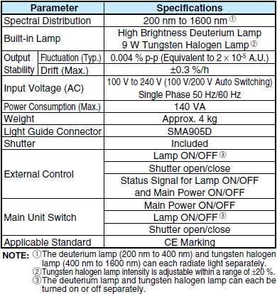 通過使用安裝在同一外殼內(nèi)的高亮度氘燈和鹵鎢燈,該光源能通過光波導(dǎo)(單賣)輸出200nm到1600nm的光。輸出的光強大約是現(xiàn)有型號的兩倍。緊湊的尺寸和較輕的重量使其易于攜帶。機械快門和外部控制等實用的功能使其易于使用。這種新型光源同時適用于多種型號的便攜式設(shè)備。