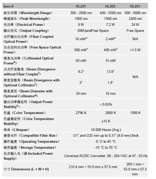 所有光源型號都有一個集成濾光片支架,其中HL201 和HL202 提供用于光纖輸出的SMA 接頭,而HL203為自由空間輸出。光纖耦合光源上的光纖耦合封裝能被準直封裝(分開出售)代替,快速釋放裝置用于安裝光纖耦合封裝,以保證在代替光纖耦合封裝時保持耦合效率。通過對定制光學系統(tǒng)使用SM1QAM 快速釋放轉接件,內螺紋透鏡套筒也可以直接附加到每個光源前。由于光源尺寸小(請見規(guī)格標簽),用戶能夠靈活地放置在擁擠的光學平臺上。所有光源可以通過底部的兩個M6 螺孔安裝在Ø1 英寸接桿上。