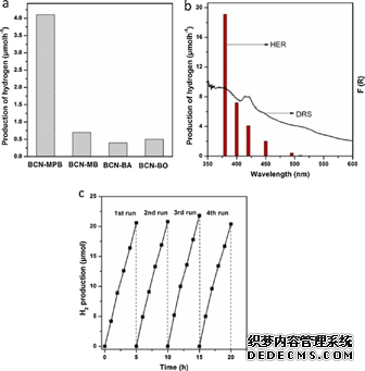 其中,BCN-MPB為納米片,這與其他三種產(chǎn)物不同(BCN-MB、BCN-BA、BCN-BO)。與塊體BCN相比,BCN-MPB具有更大的比表面積、更長(zhǎng)的光生載流子壽命和更強(qiáng)的電子輸運(yùn)能力。因此,其在可見光輻射下具有增強(qiáng)的光催化產(chǎn)氫性能。