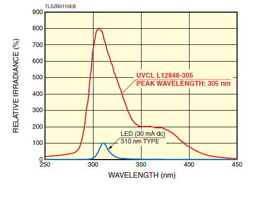 紫外陰發(fā)射光源是一種深紫外光源,其通過利用電子束來進行發(fā)光,以此實現產品的“零汞”。該產品亮度的峰值波長是紫外LED的8倍左右,另外,其尺寸小巧緊湊,內涵一個內置電源,因此它可被安裝到任何一種儀器中進行使用。